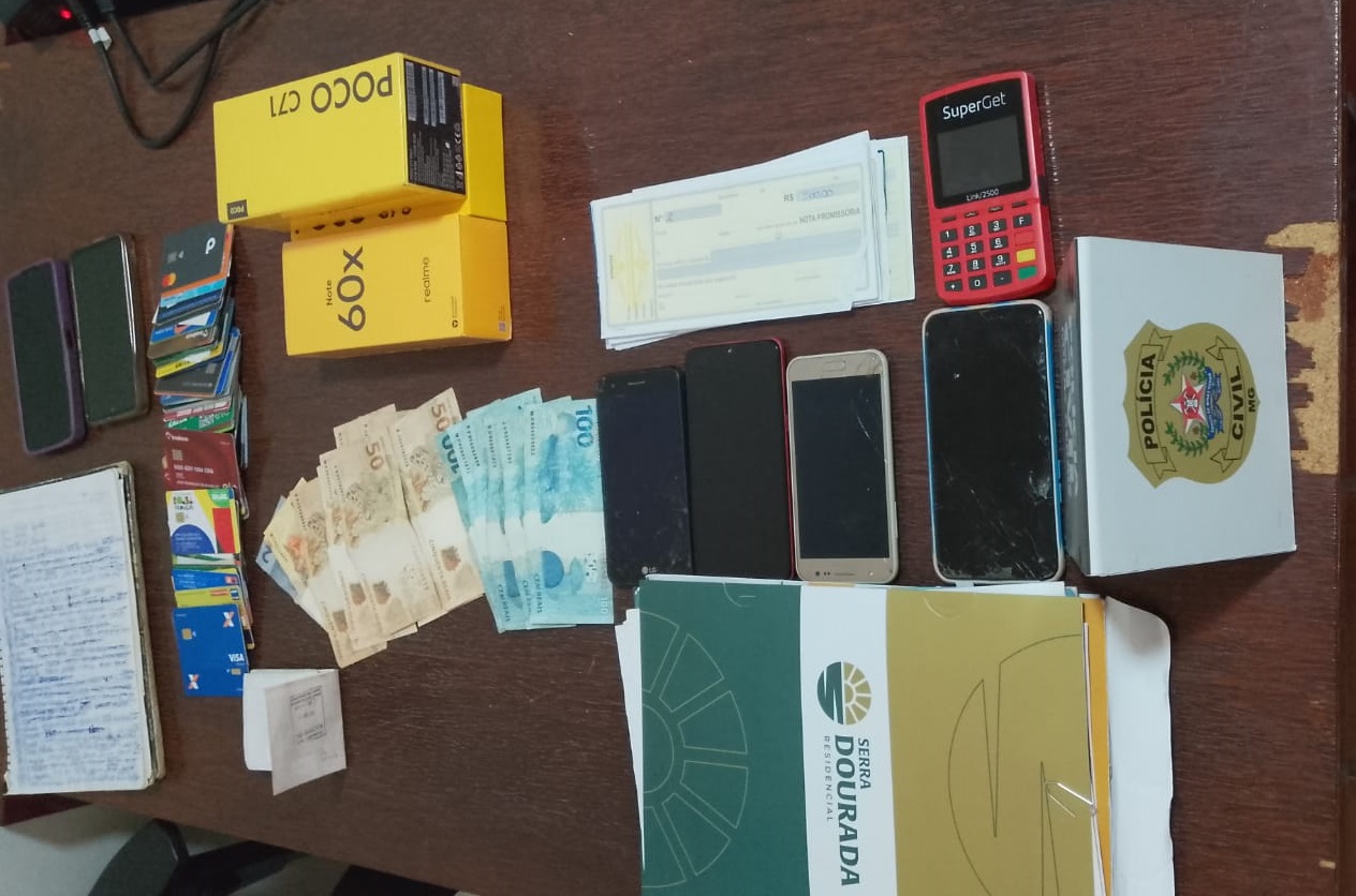 Dentre os objetos apreendidos, estão um revólver calibre 32, dinheiro, celulares e cartões bancários.