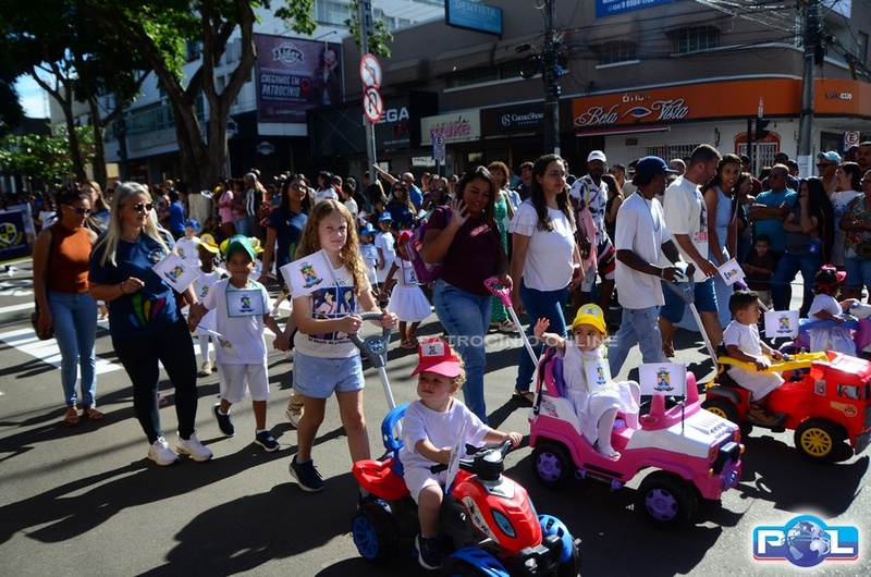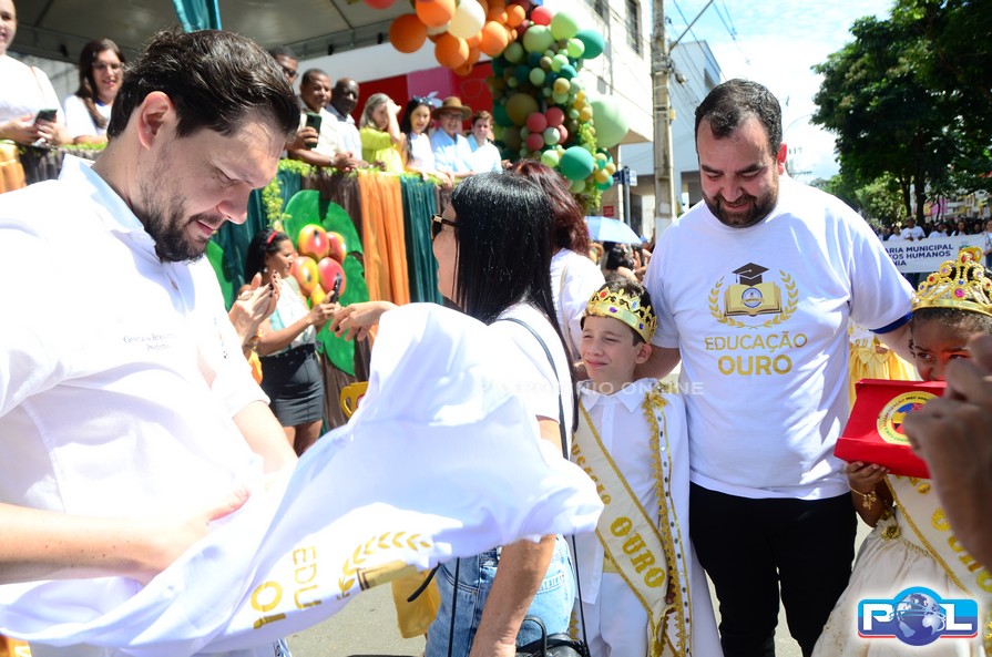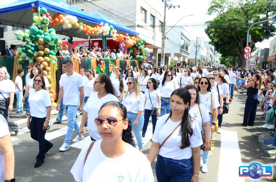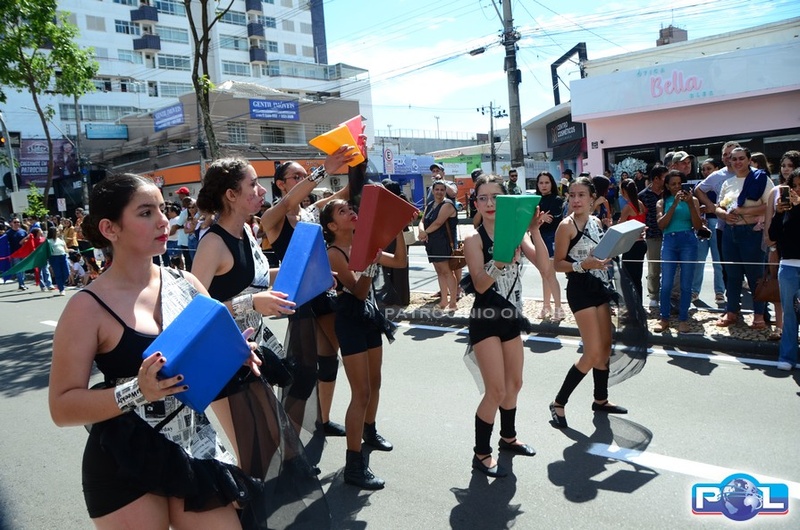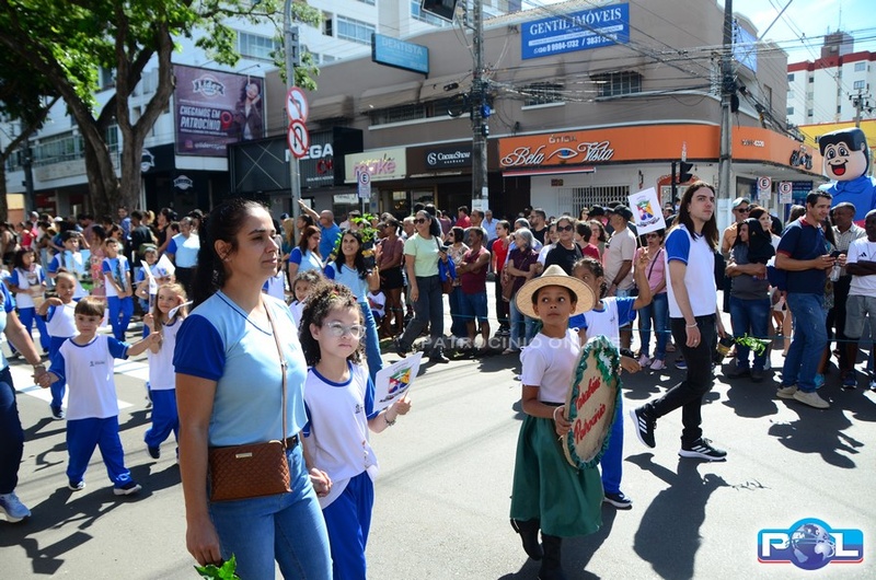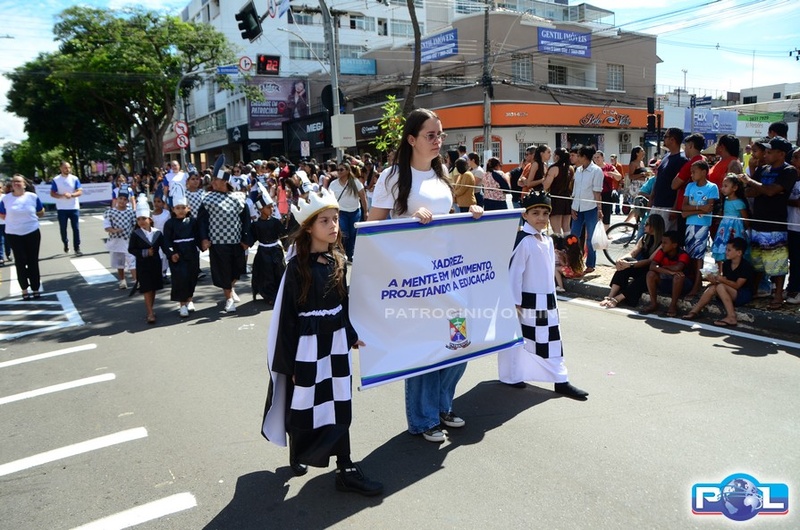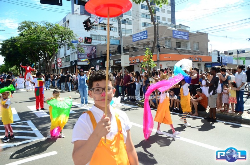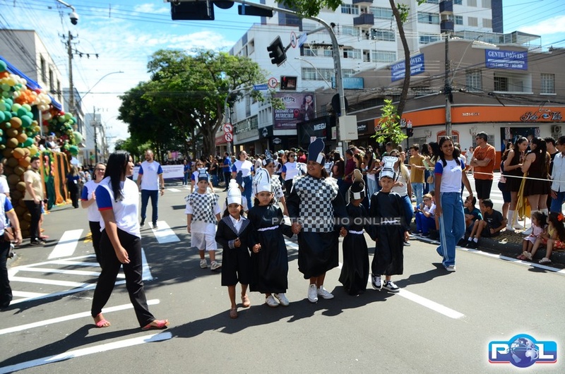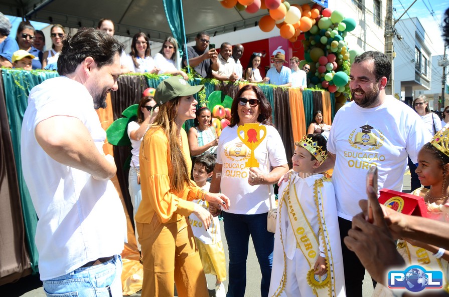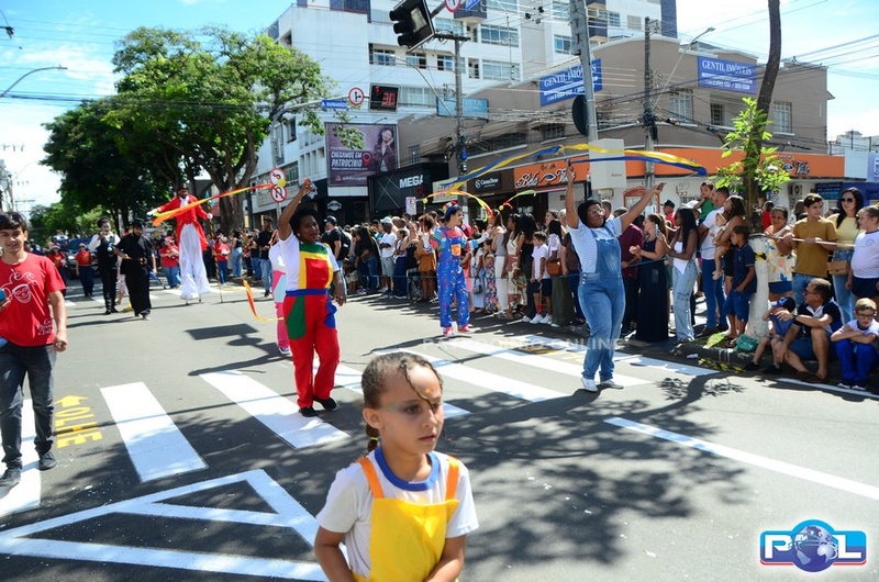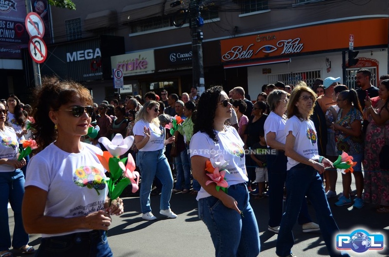 A educação teve destaque no desfile, com a participação de projetos e núcleos da rede municipal, evidenciando ações nas áreas de alfabetização, ensino especializado, línguas, ciências, artes, esportes e tecnologia.