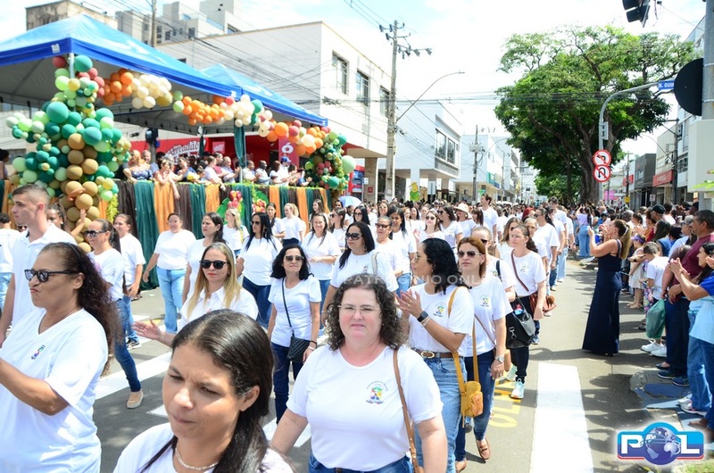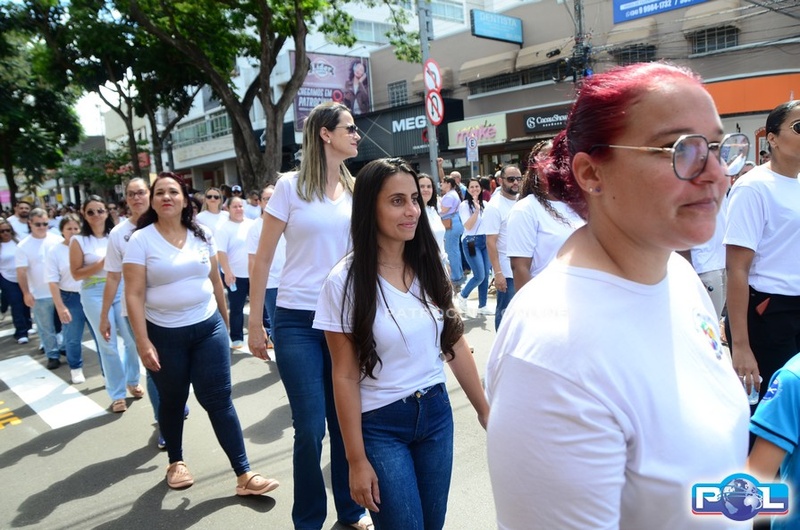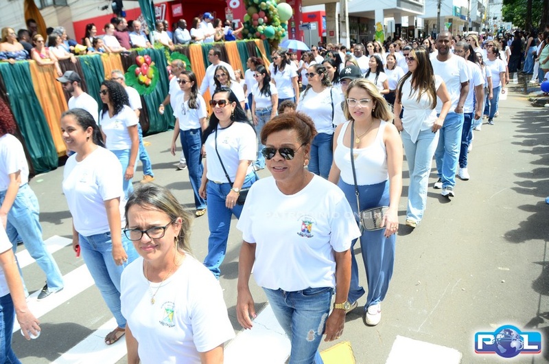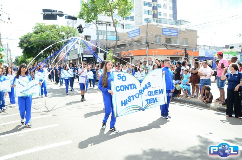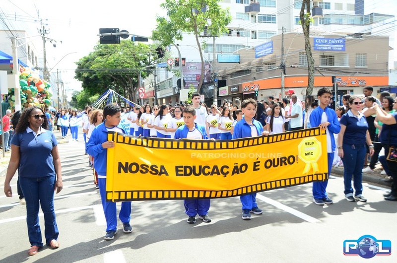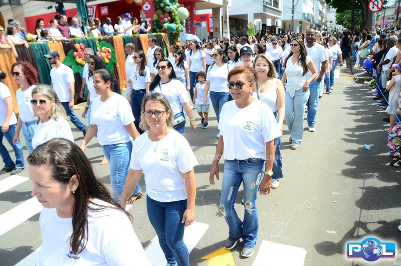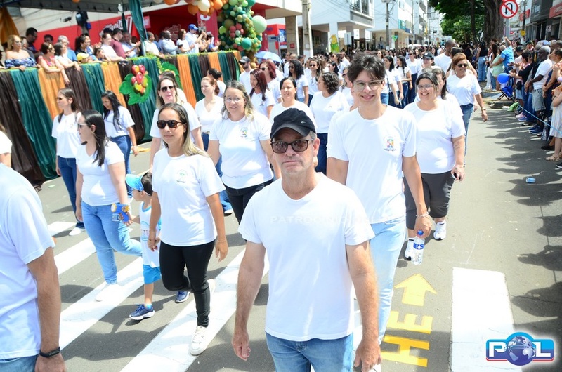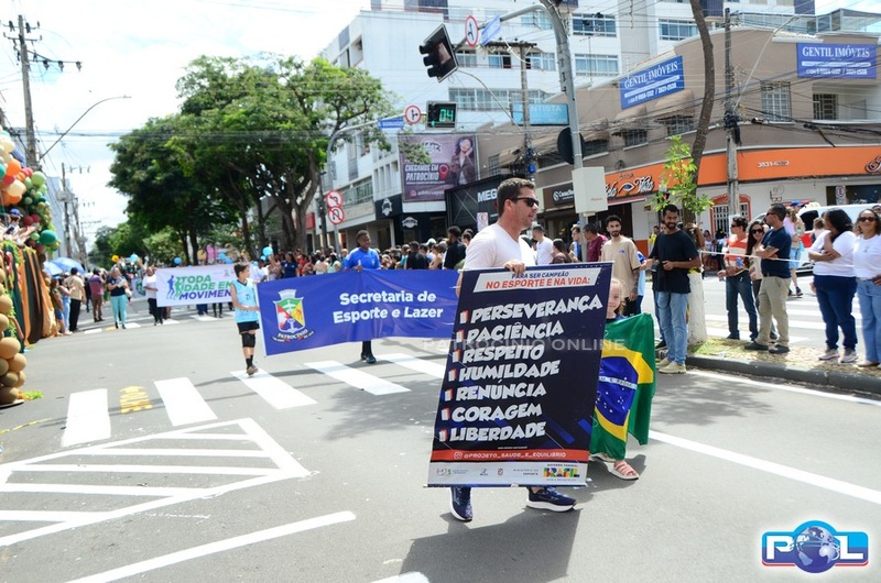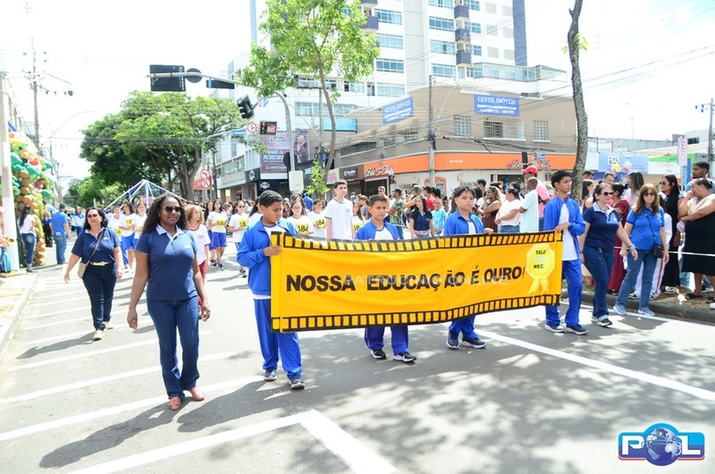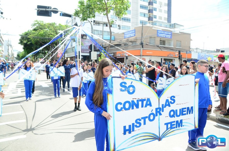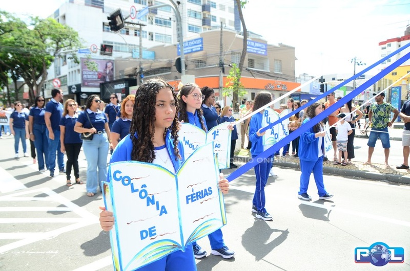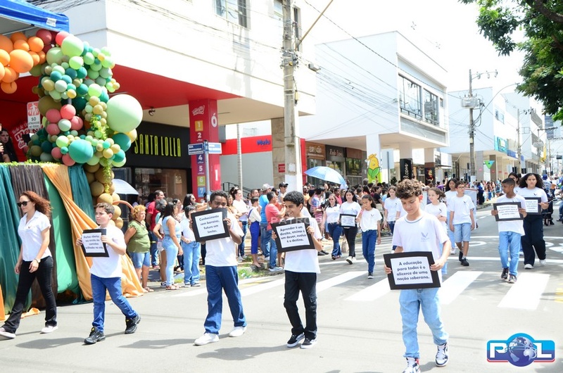 A educação teve destaque no desfile, com a participação de projetos e núcleos da rede municipal, evidenciando ações nas áreas de alfabetização, ensino especializado, línguas, ciências, artes, esportes e tecnologia.