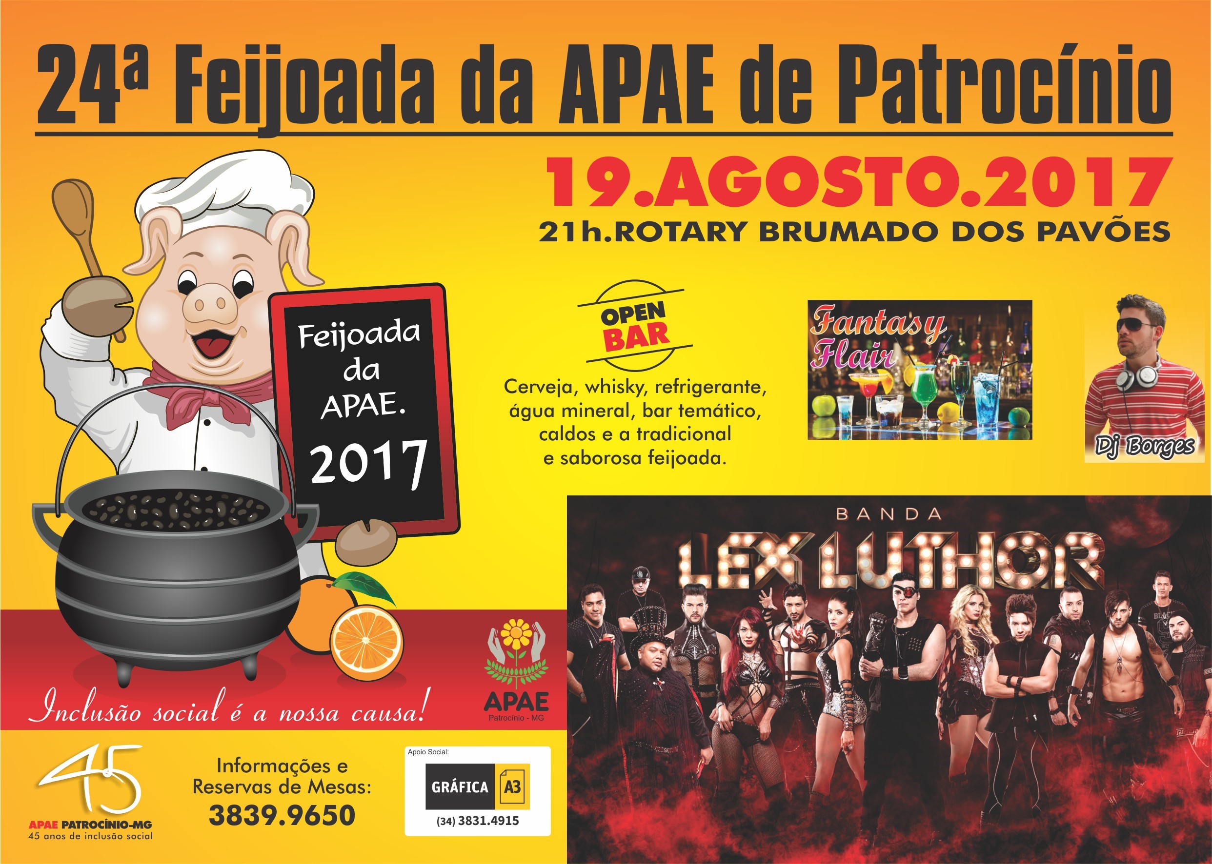 Lembrando que será realizada no dia 19 de agosto, no Rotary “Brumado dos Pavões”, às 21 horas, a 24ª FEIJOADA DA APAE Com a participação animadora do amigo Apaeano DJ Borges e Banda Lex Luthor, que faz grande sucesso, num envolvimento de sons, ritmos, estilos, qualidade e inovação. O valor da mesa com 6 lugares é de R$ 780,00, podendo ser parcelado no cartão de crédito e ingresso avulso no valor de R$ 130,00. As reservas de mesas, estão sendo realizadas na APAE de Patrocínio, pelo telefone (34) 3839-9650, entrar em contato com Cláudia.