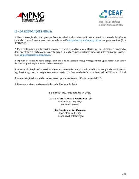 O processo seletivo tem validade de 6 meses, podendo ser prorrogado por igual período, e seguirá estritamente as normas do MPMG e do edital na galeria abaixo