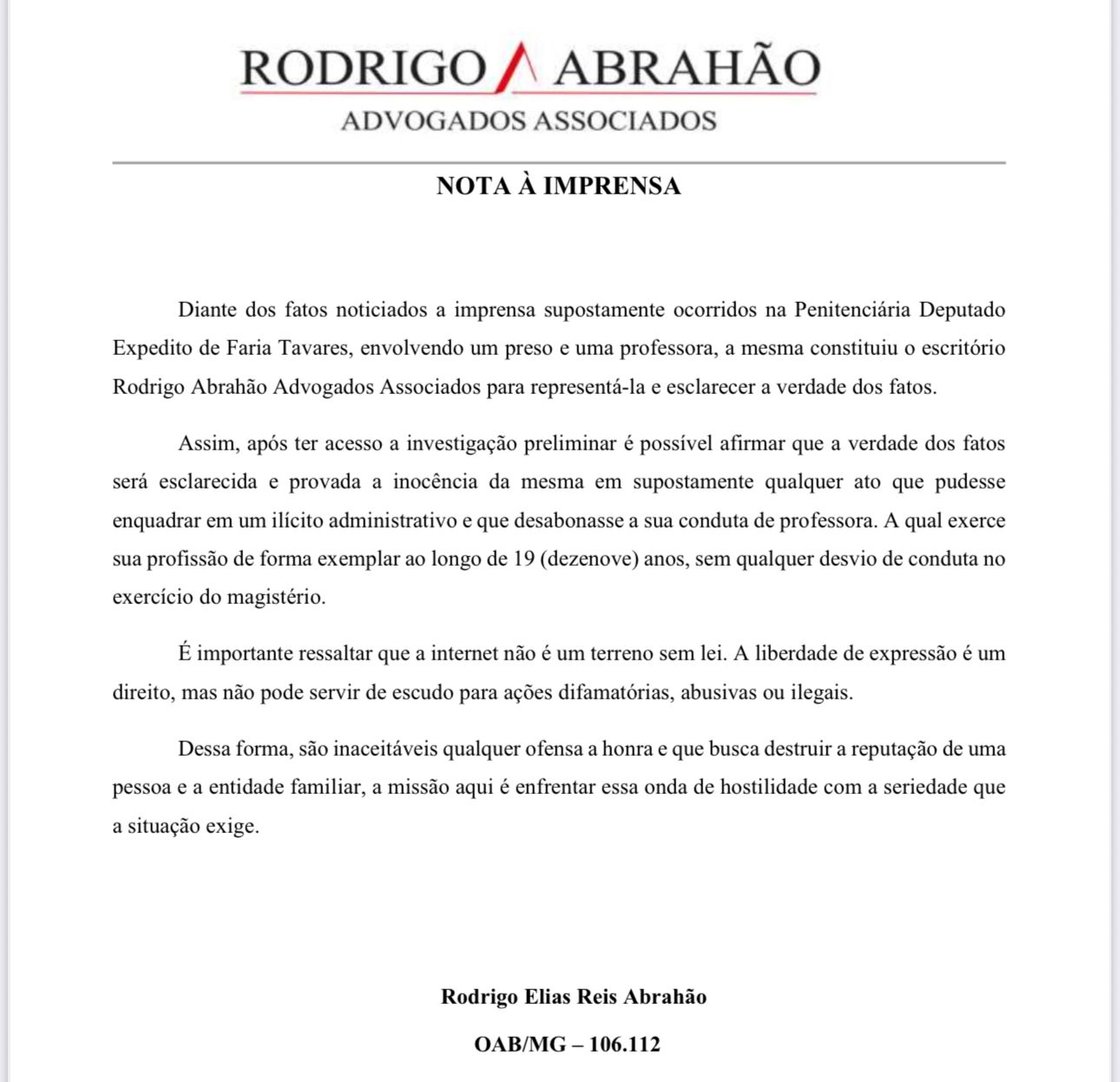 O escritório Rodrigo Abrahão Advogados Associados foi constituído pela professora que segundo nota da Secretaria de Estado de Segurança Pública, foi flagrada por agentes penitenciários na manhã de quinta-feira, 23/10, por volta das 10h00, durante o período de aulas na escola estadual que funciona dentro da Penitenciária Deputado Expedito de Faria Tavares, em Patrocínio, em situação de intimidade com detento.