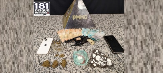 Foram apreendidos: um revólver calibre .32, 6 munições calibre .32, 3 tabletes de maconha, uma bucha de maconha, uma porção de cocaína em pedras, uma porção de cocaína em pó, dois celulares e R$ 1.550,00 reais.