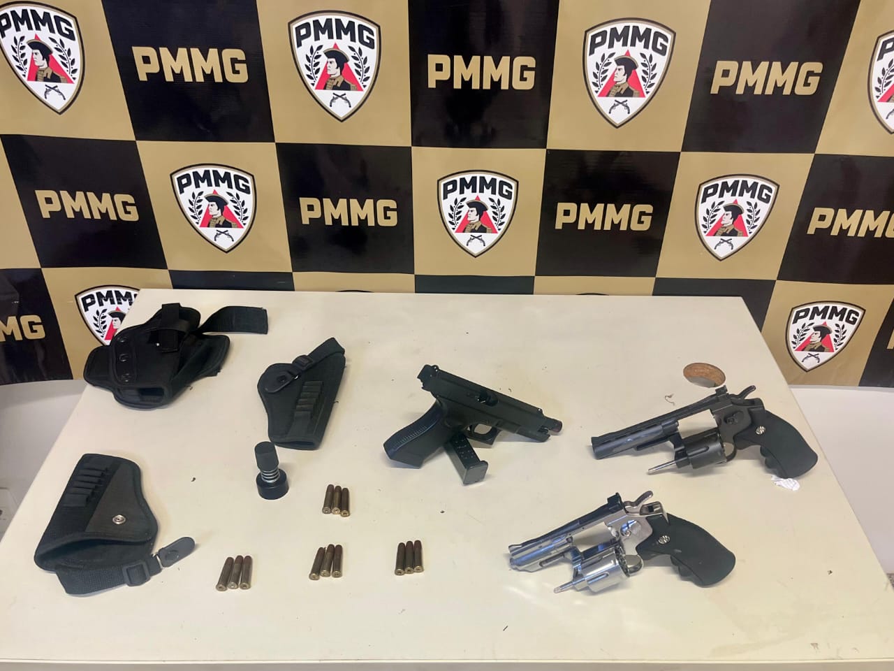 Os militares após conversa e diálogo, encontraram três simulacros de arma de fogo, além de doze simulacros de munição, três coldres e um jet loader.