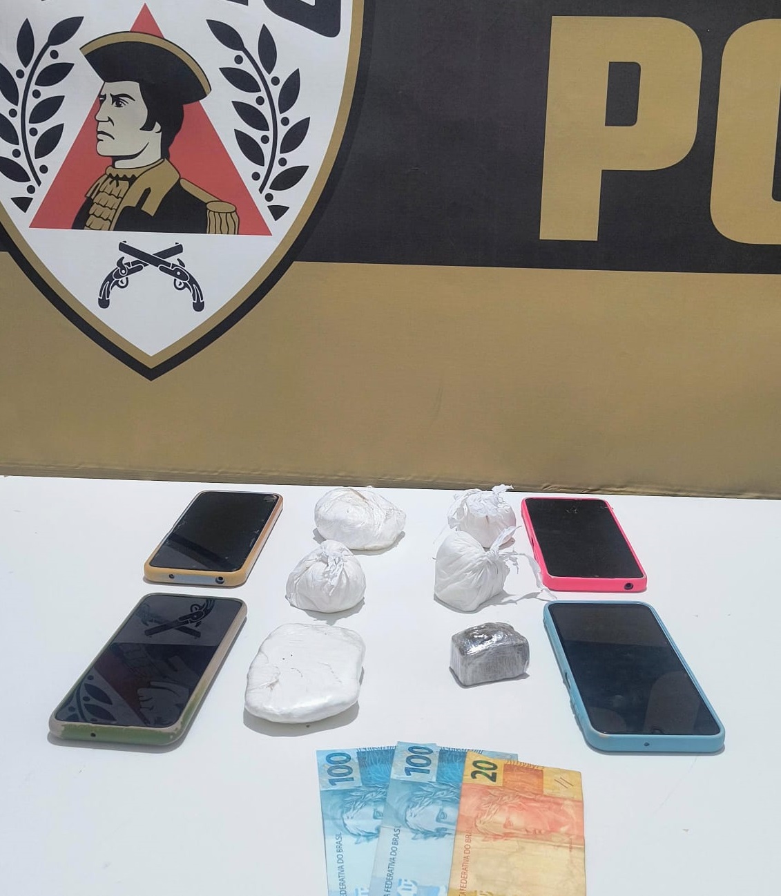 Foram apreendidos: uma porção de maconha, 5 porções grandes de cocaína, 04 celulares e um veículo utilizado no crime.