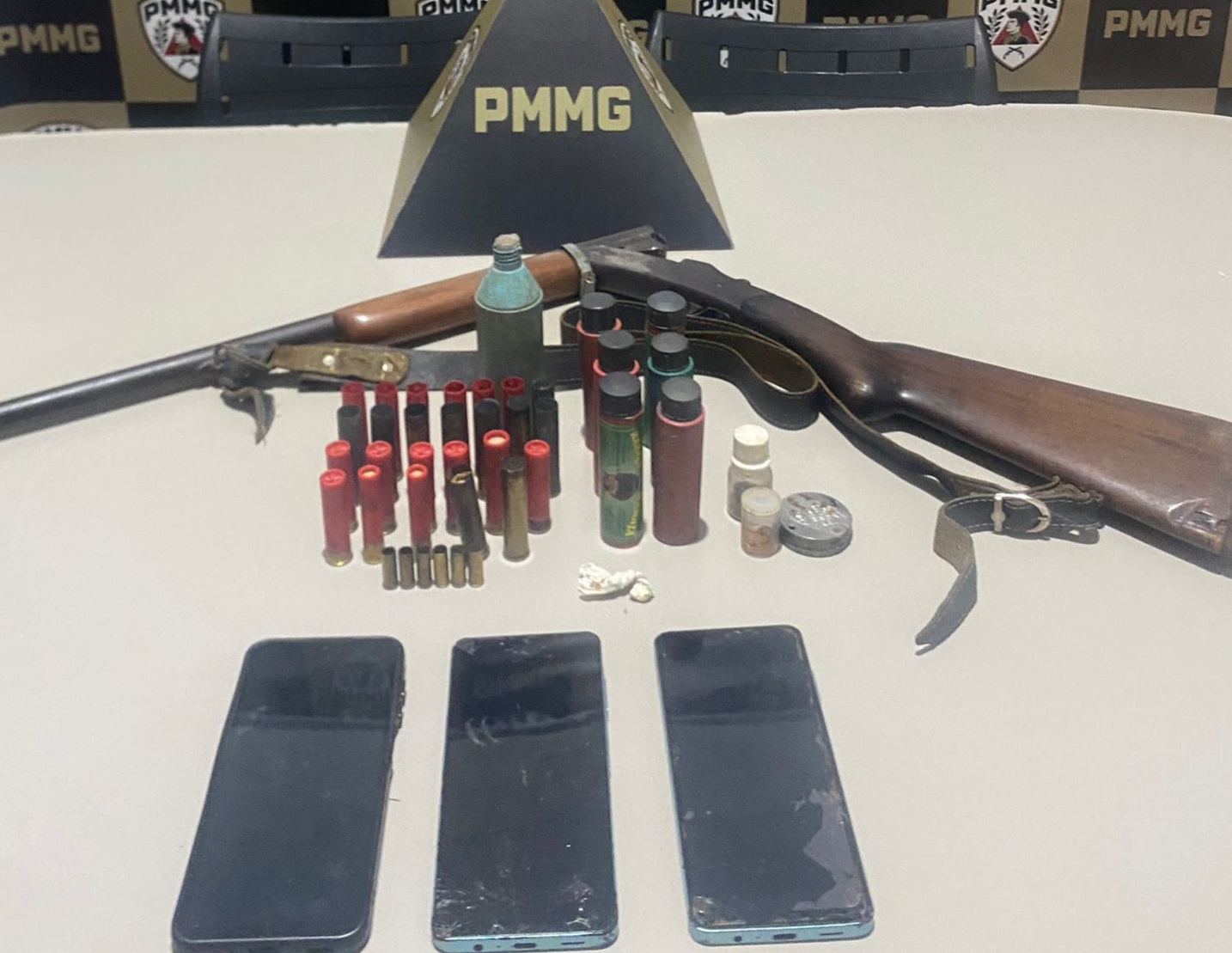Foram apreendidos uma espingarda calibre .32, munições intactas de diversos calibres, munições deflagradas, material para recarga de cartuchos (pólvora, espoletas e chumbo), um papelote de cocaína e 03 celulares.