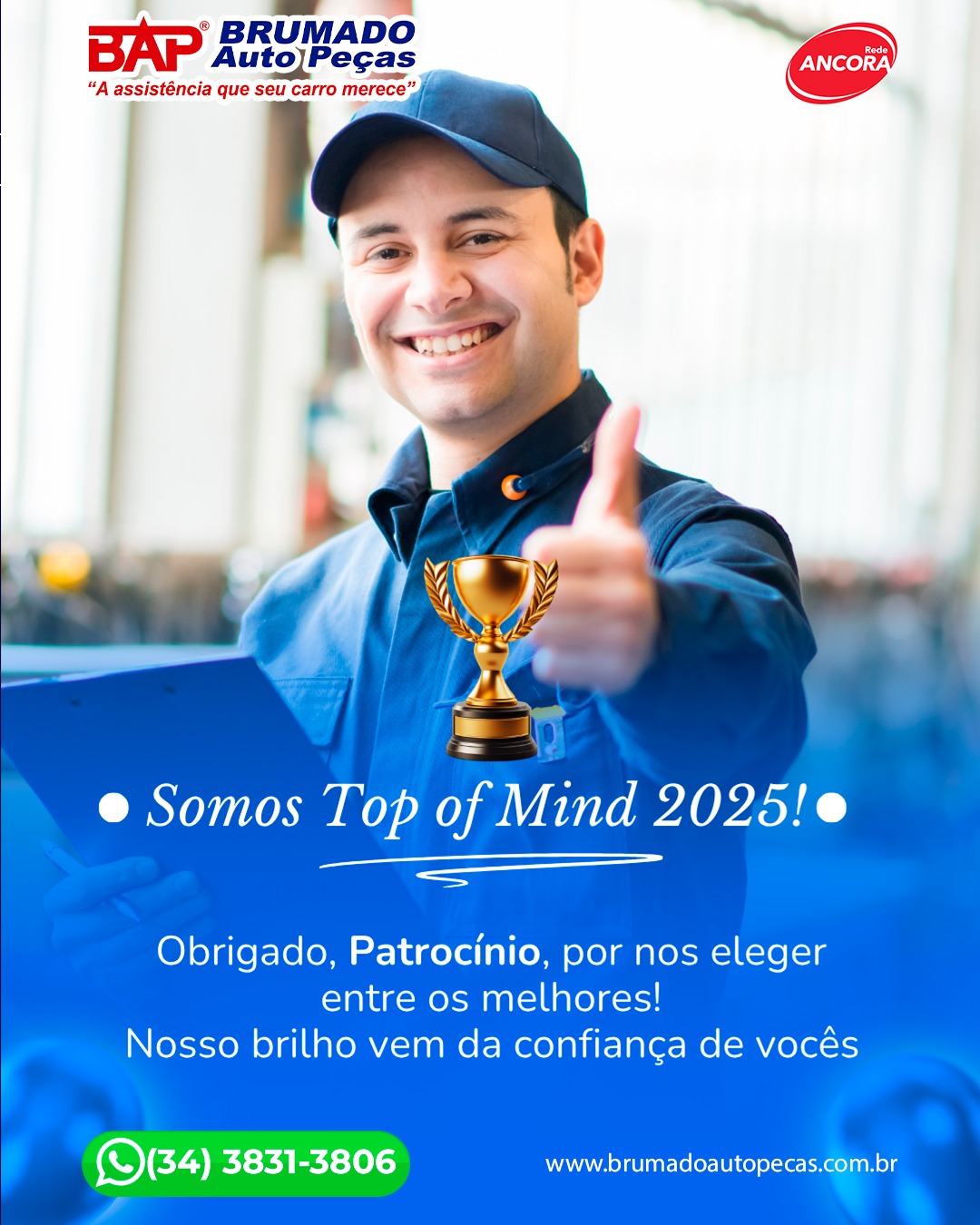 É com o coração transbordando de alegria e gratidão que que anunciamos: A Brumado Auto Peças foi eleita *Top of Mind 2025 * realizado pela ACIP / CDL na categoria Oficina Mecânica / Manutenção de veículo!