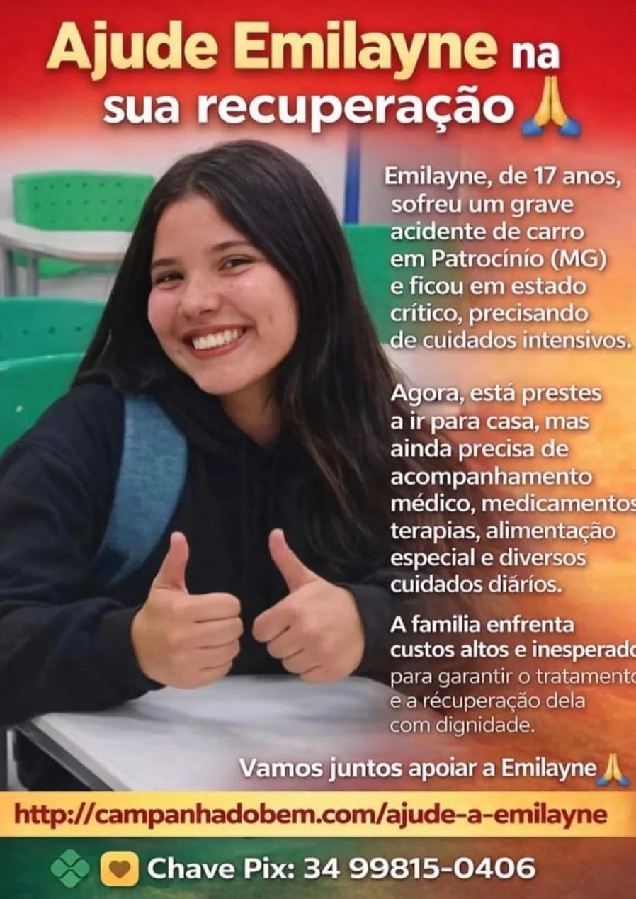 Para contribuir, basta acessar o site http://campanhadobem.com/ajude-a-emilayne ou fazer uma doação via Pix pelo número 34 99815-0406.