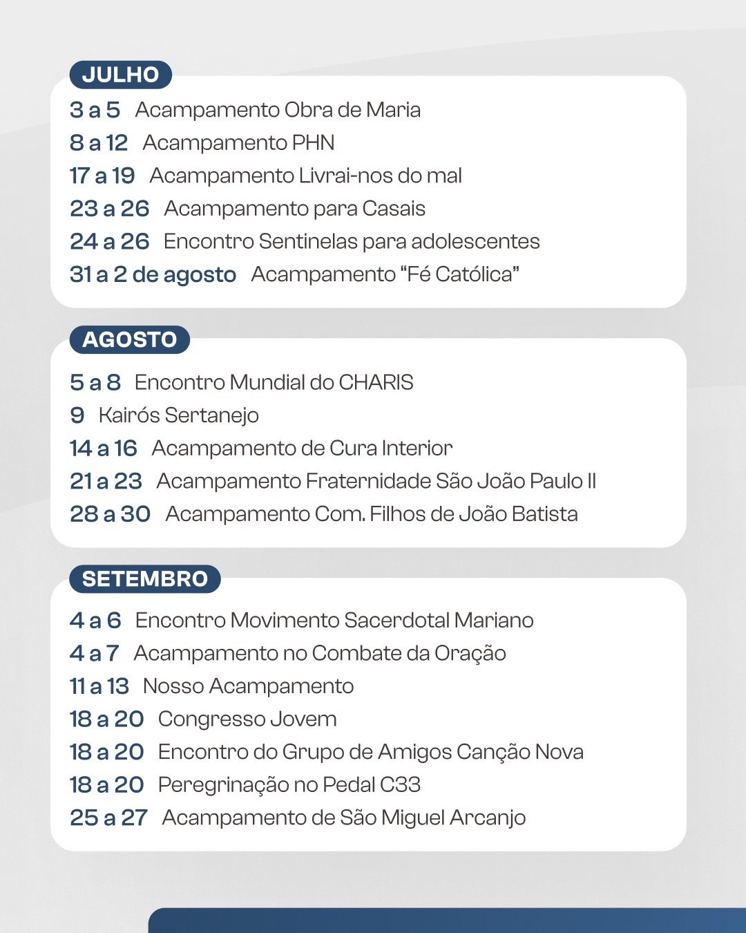 Outro destaque da programação são os encontros: Nacional da RCC – ENF (janeiro), Famílias em Pé (fevereiro), Mães que Oram pelos Filhos (abril), Mundial do Charis (agosto), Movimento Sacerdotal Mariano (setembro).