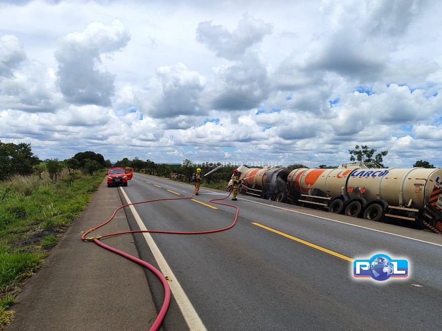 Os militares do Corpo de Bombeiros foram acionados para uma ocorrência de tombamento de uma carreta carregada com combustível que pegou fogo na BR-365, entre o trevo de acesso a São Gonçalo do Abaeté e o entroncamento com a BR-040, no distrito de Luizlândia do Oeste, na manhã desta quinta-feira, 15/1/26. Uma fumaça densa se formou no local.