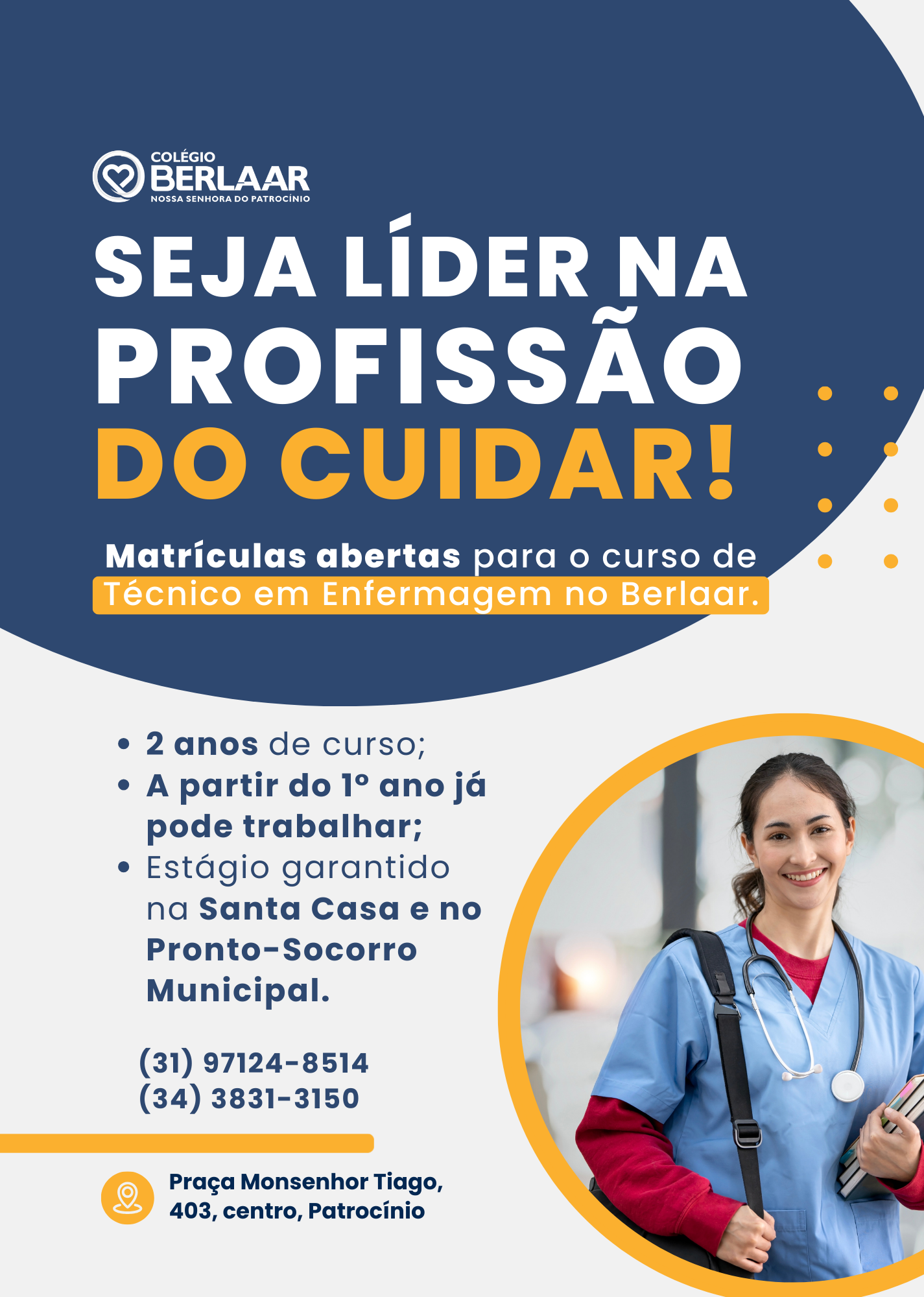 O Colégio Berlaar Nossa Senhora do Patrocínio está com matrículas abertas para o curso Técnico em Enfermagem, formação voltada para quem deseja ingressar na área da saúde com preparo técnico e prática profissional desde os primeiros passos da carreira.