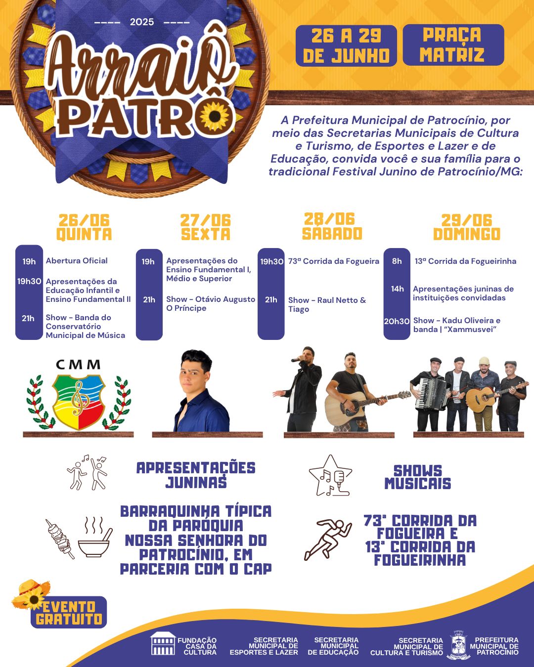 Começa nesta quinta-feira, 26 de junho, o Arraiô Patrô, um dos eventos juninos mais esperados da região! Promovido pela Prefeitura Municipal de Patrocínio, por meio das Secretarias de Cultura e Turismo, Esportes e Lazer e Educação, o evento vai até o dia 29 de junho, com entrada gratuita na tradicional Praça da Matriz.