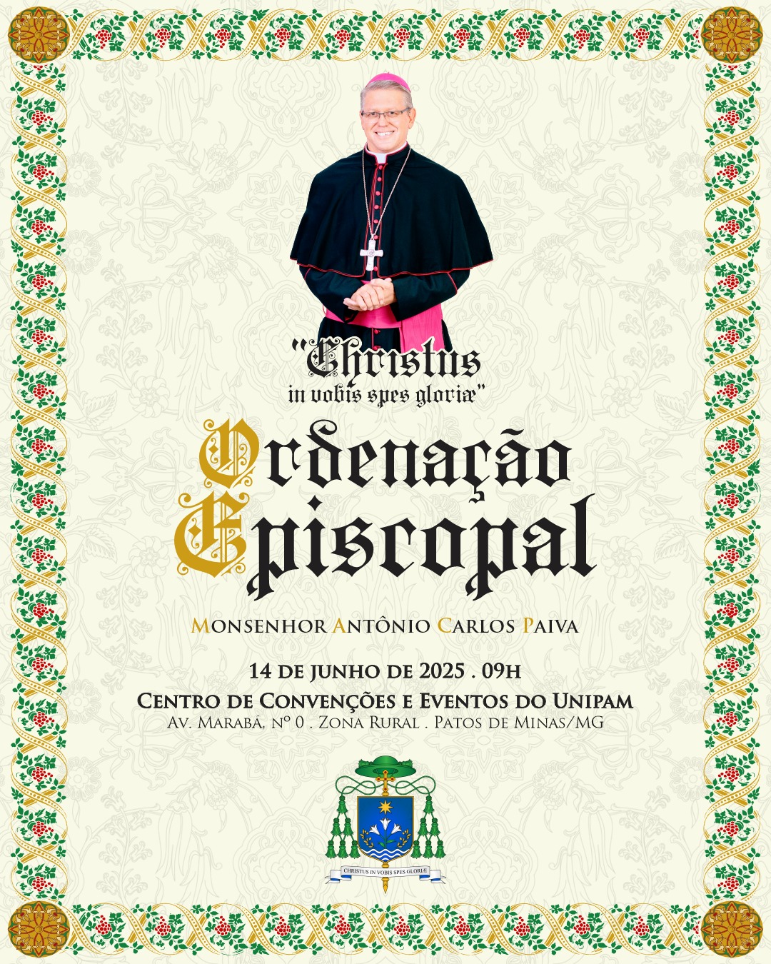 O novo bispo será ordenado no dia 14 de junho de 2025, às 9h, no Centro de Convenções e Eventos do UNIPAM, em Patos de Minas.