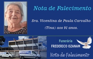 Nota de falecimento: Sra. Vicentina de Paula Carvalho (Tina) aos 91 anos.