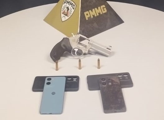 Foram apreendidos um revólver calibre .357 Magnum, três munições intactas e três celulares.