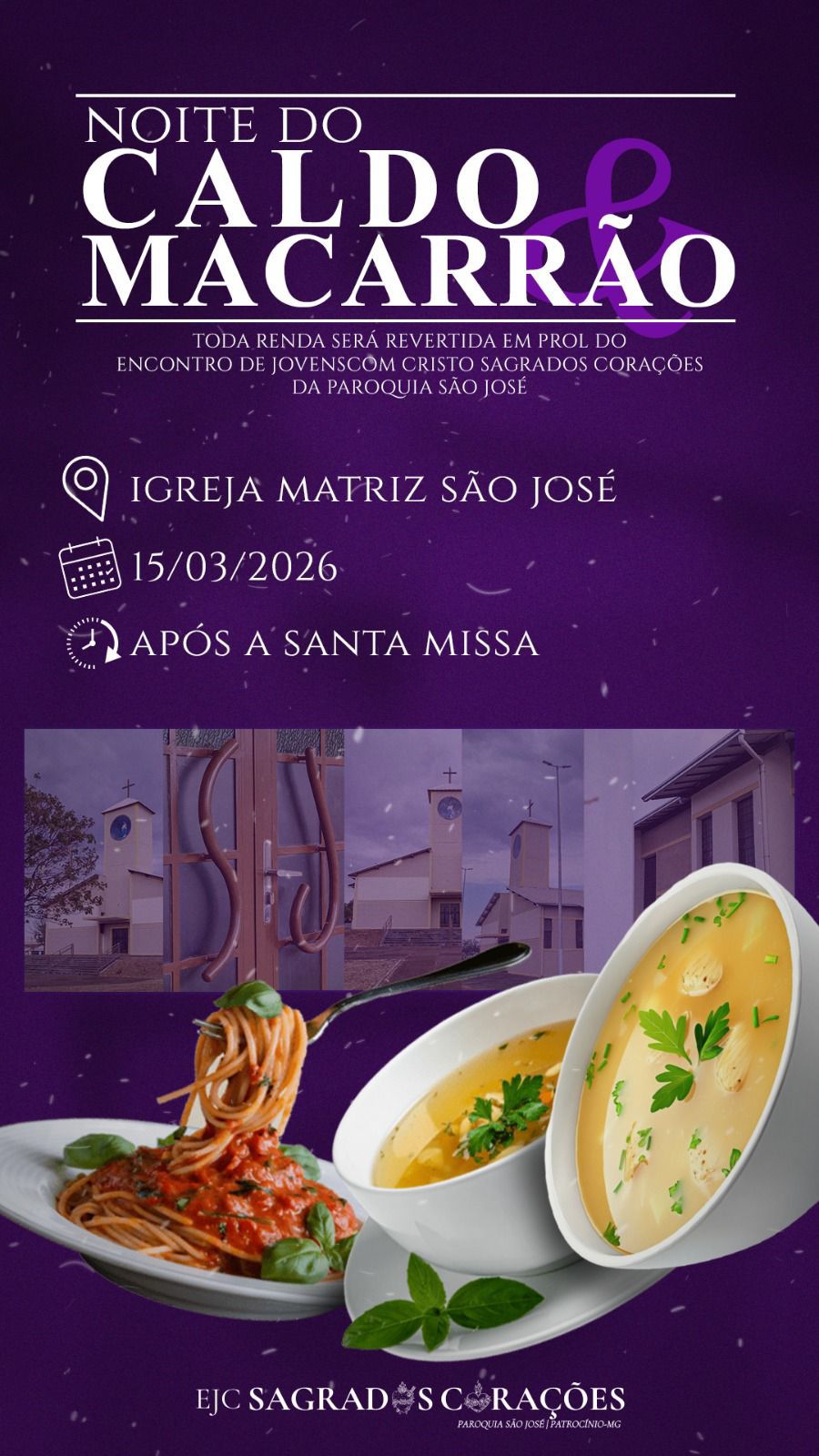 PATROCÍNIO (MG) – O EJC Sagrados Corações, pertencente à Paróquia São José, realizará no próximo domingo, 15 de março, a “Noite do Caldo & Macarrão”.