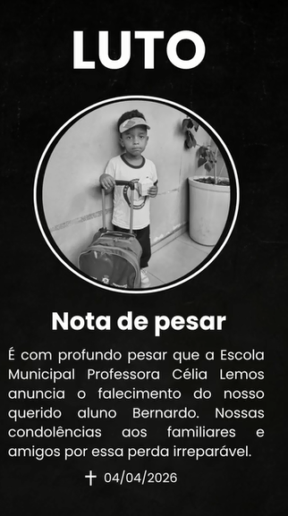 “É com profundo pesar que a Escola Municipal Professora Célia Lemos anuncia o falecimento do nosso querido aluno Bernardo. Nossas condolências aos familiares e amigos por essa perda irreparável.”