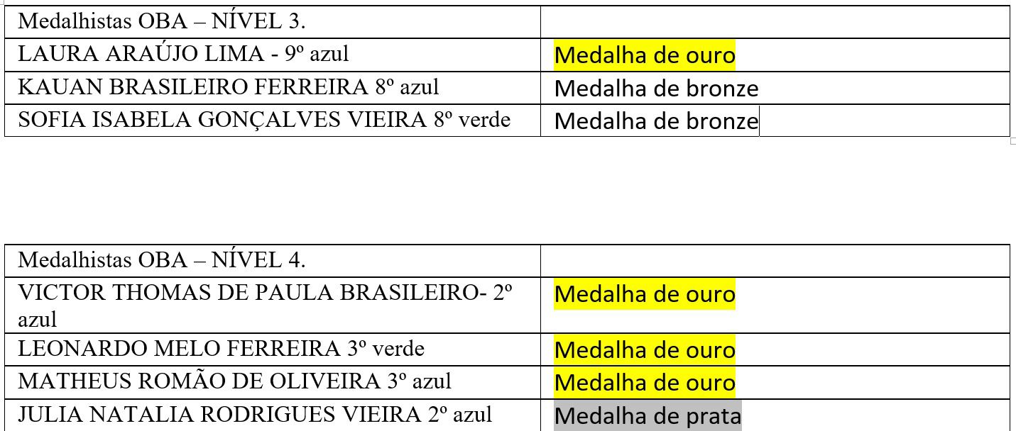 Também receberam medalha de ouro: Laura Araújo Lima, do 9º ano azul também ; Leonardo Melo Ferreira, do terceiro verde e Matheus Romão do Terceiro Azul. Júlia Natália Rodrigues, do 2º azul, ficou com a Medalha de Prata.