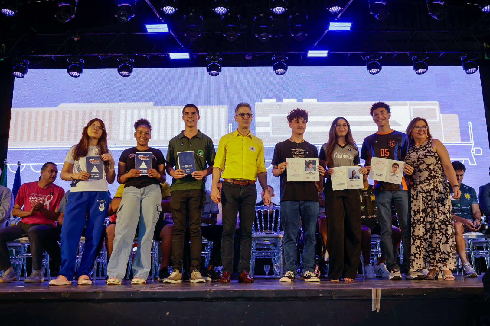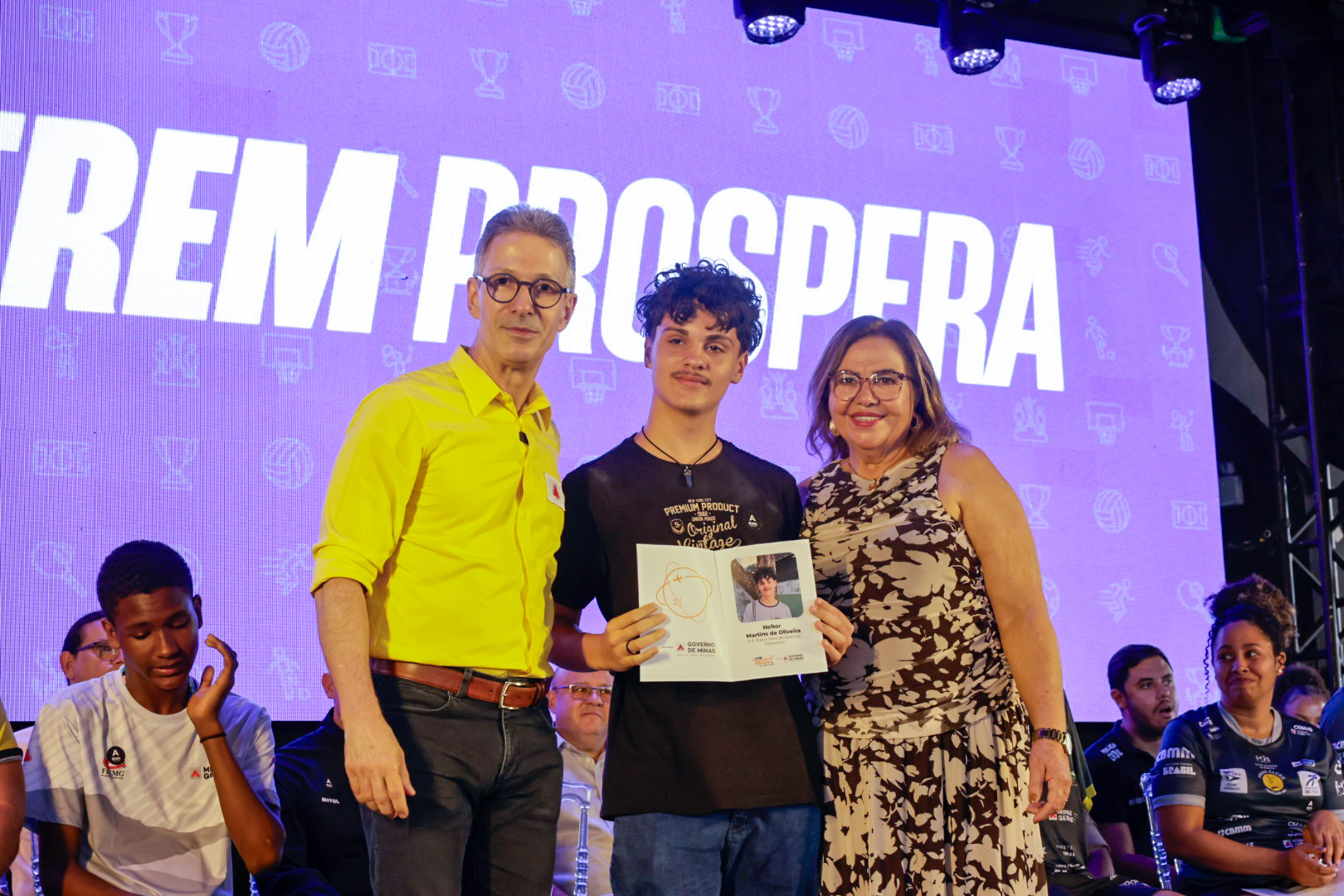 Os alunos Heitor Martins, do 1º ano do Ensino Médio da Escola Dalva Stela de Queiroz, de Patrocínio, e Micael Alves Honório, da Escola Estadual Irmãos Guimarães, de Guimarânia, receberam das mãos do governador Romeu Zema o passaporte simbólico que marca a conquista de uma vaga no programa Passaporte Mineiro do Conhecimento. A entrega aconteceu na segunda-feira, 6/10, durante a cerimônia de abertura dos Jogos Escolares Brasileiros (JEBs) 2025, em Uberlândia, e da entrega do certificado de Alfabetização Nota 10 para a Prefeitura de Uberlândia.
