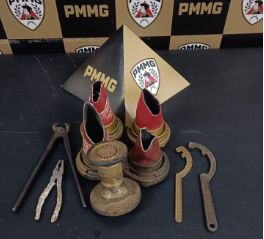 Um indivíduo havia sido flagrado no interior do estabelecimento e contido ao tentar se evadir. Com a chegada da equipe policial, foram localizados na mochila do suspeito cinco bocais de mangueira tipo bombeiro, de cobre, duas chaves utilizadas para o manuseio dos bocais e ferramentas possivelmente utilizadas na prática do crime.
