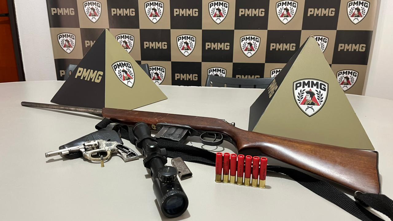 A PM, com autorização do responsável pelo imóvel, realizou busca domiciliar, localizou e apreendeu um revólver calibre .22, munições de calibres .22 e .36 e, posteriormente, uma espingarda indicada por familiar.