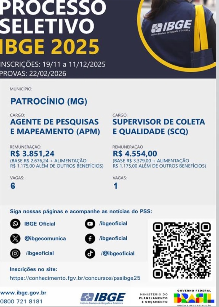 O Instituto Brasileiro de Geografia e Estatística (IBGE) está com inscrições abertas para o Processo Seletivo 2025, que oferece vagas temporárias em todo o país. Em Patrocínio (MG), serão 7 oportunidades distribuídas entre dois cargos.