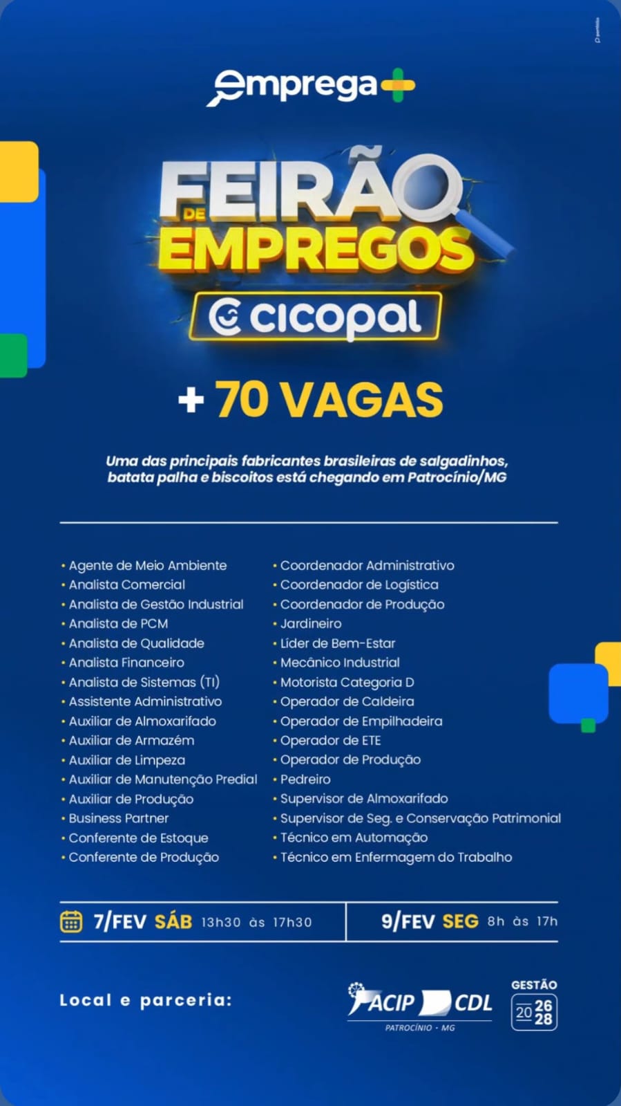 PATROCÍNIO (MG) – Um dos principais fabricantes brasileiros de salgadinhos, batata palha e biscoitos Cicopal realiza um feirão de empregos em Patrocínio, com mais de 70 vagas disponíveis para diferentes áreas profissionais. O evento acontecerá nos dias 7 e 9 de fevereiro, em parceria com a ACIP/CDL em Patrocínio. ACIP/CDL está localizada na Rua Joaquim Carlos dos Santos, 141 – Cidade Jardim, Patrocínio.