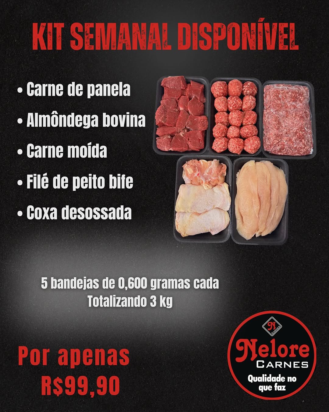 Benefícios Kit Semanal: - Facilita sua rotina - Economize tempo - Produtos de alta qualidade - Carnes frescas 5 bandejas de 600g cada, totalizando 3kg. Por apenas R$99,90! Reserve seu kit: (34) 38313552