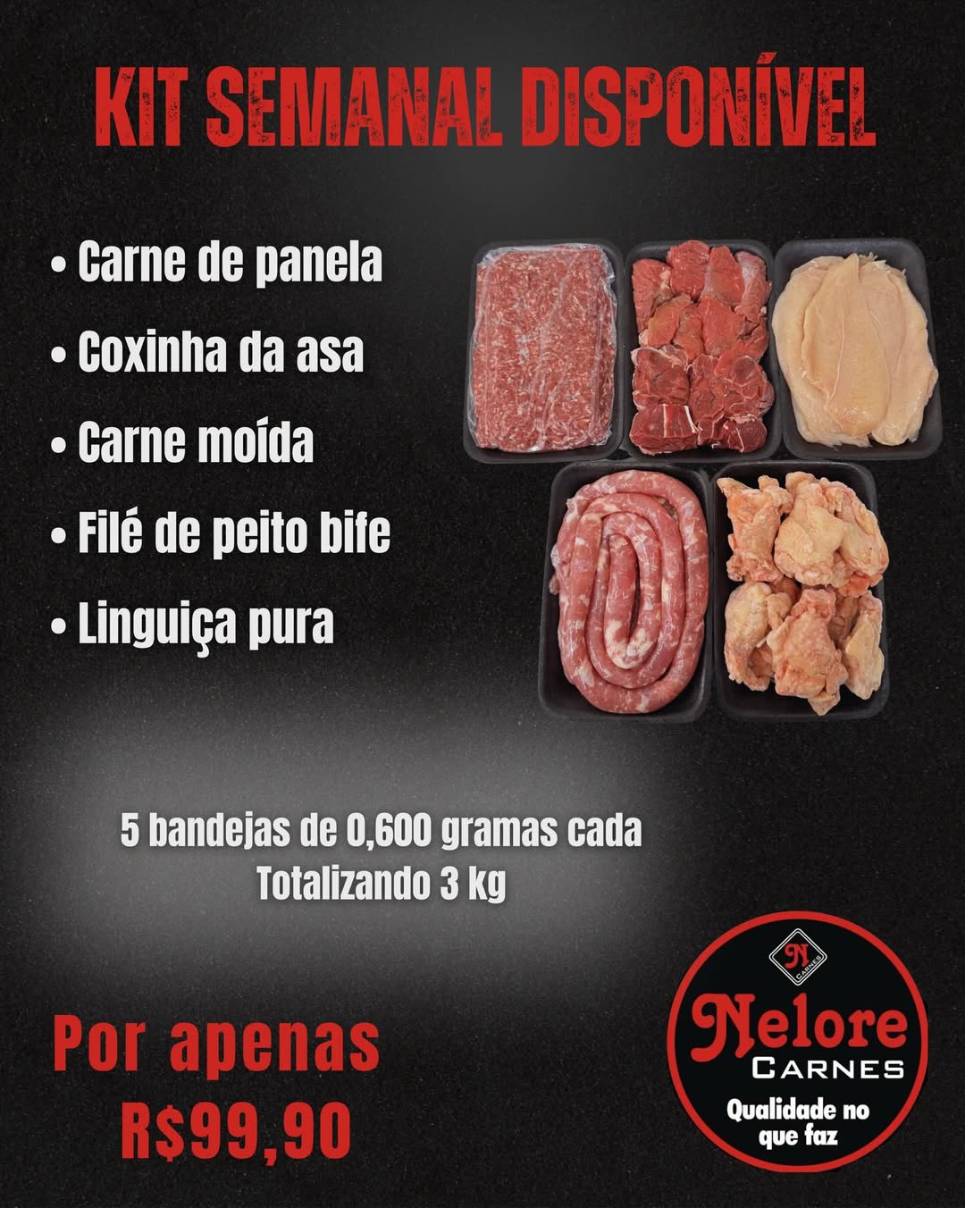 Benefícios Kit Semanal: - Facilita sua rotina - Economize tempo - Produtos de alta qualidade - Carnes frescas 5 bandejas de 600g cada, totalizando 3kg. Por apenas R$99,90! Reserve seu kit: (34) 38313552