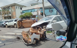 Veículo capota após colisão lateral com outro carro em frente a laboratório no centro de Patrocínio