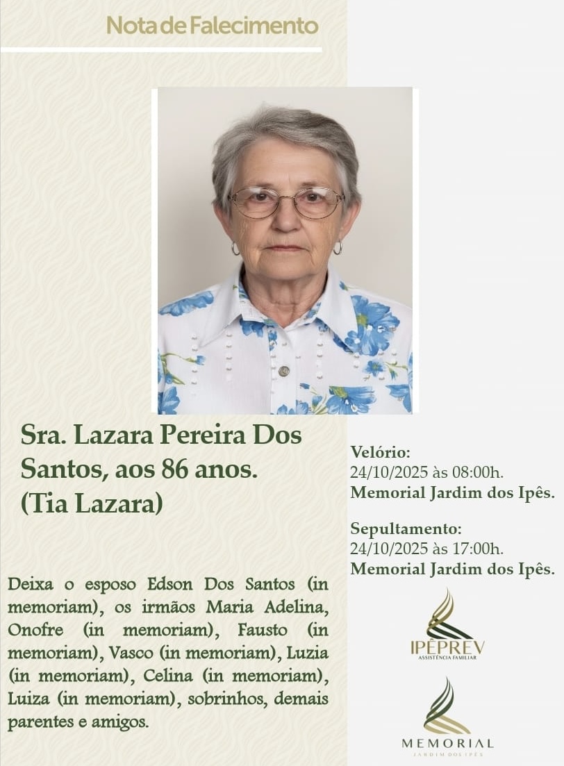 Nota de falecimento: Lazara Pereira Dos Santos, aos 86 anos. (Tia Lazara)