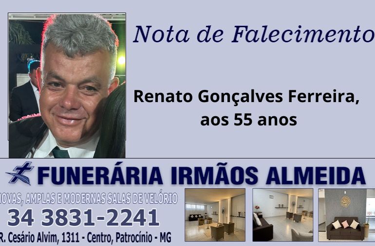 Faleceu hoje, em Patrocínio, o senhor Renato Gonçalves Ferreira, aos 55 anos.