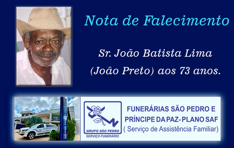 Faleceu nesta sexta-feira, 13/06/2026, em Serra do Salitre/MG, Sr. João Batista Lima (João Preto) aos 73 anos.