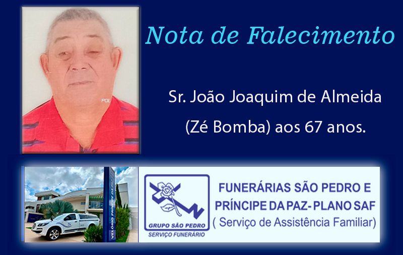 Faleceu nesta terça-feira, 28/4 em Patrocínio/MG, o Sr. João Joaquim de Almeida (Zé Bomba) aos 67 anos.