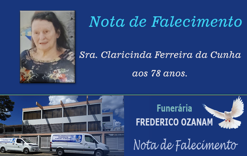 Faleceu nesta segunda-feira, 22 de dezembro de 2025, em Patrocínio/MG, a Sra. Claricinda Ferreira da Cunha, aos 78 anos.