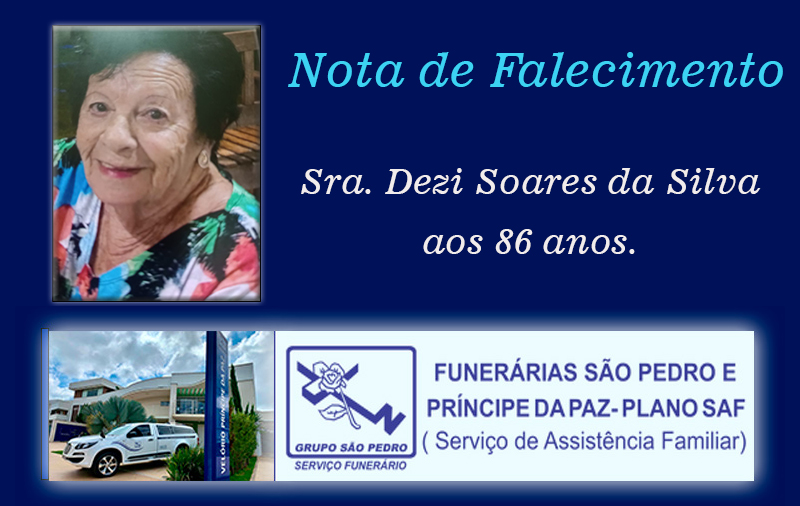 Faleceu nesta terça-feira, 25/11 em Patrocínio (MG), Sra. Dezi Soares da Silva aos 86 anos.