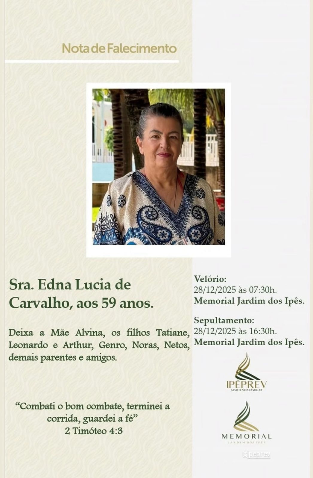 Nota de falecimento: Sra. Edna Lucia de Carvalho, aos 59 anos.