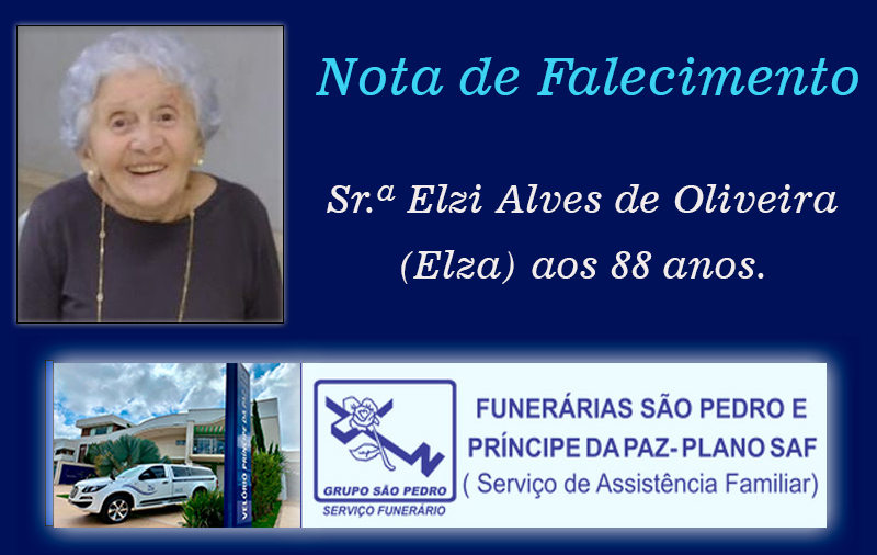 Faleceu nesta sexta-feira, 29 de janeiro de 2026, em Patrocínio/MG, Sr.ª Elzi Alves de Oliveira (Elza) aos 88 anos.