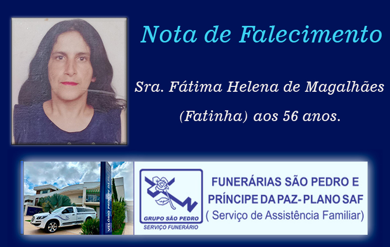 Faleceu nesta sexta-feira, 21/11, em Patrocínio (MG), Sra. Fátima Helena de Magalhaes (Fatinha) aos 56 anos.