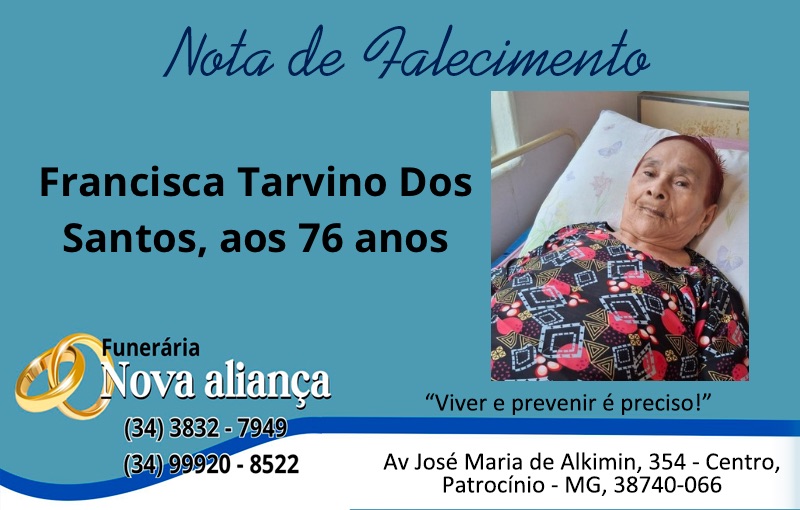 Faleceu em Patrocinio (MG) sábado dia 25/10/2025 a Sra Francisca Tarvino Dos Santos, aos 76 anos.