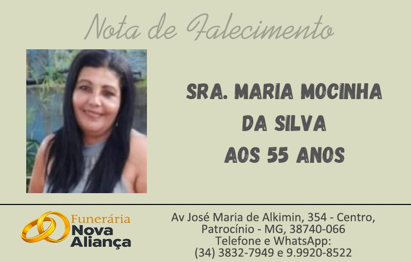 Faleceu em Macaúba de Baixo (Greenville), MG, neste domingo, dia 01/02/2026, a Sra. Maria Mocinha da Silva, aos 55 anos.