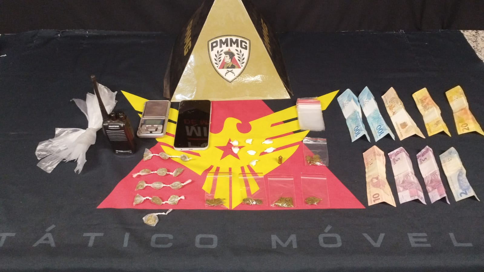 Foram apreendidos 13 buchas de maconha, 5 porções de maconha tipo “flor”, 7 papelotes de cocaína, material para embalagem de drogas, uma munição calibre .32, uma balança de precisão, um rádio comunicador, um celular e R$ 312,00 reais.