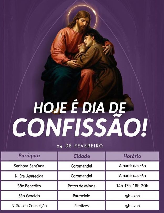 Em Patos de Minas, as confissões são realizadas na Paróquia São Benedito, nos horários das 14h às 17h e das 18h às 20h.