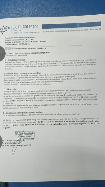Complementando o diagnóstico, um exame de eletroneuromiografia realizado em 10 de abril de 2026 pelo neurologista Dr. Thiago Santos Prado (CRM-MG 66939 / RQE 46.942) confirmou uma lesão pré-ganglionar (radiculopatia lombossacral) de intensidade moderada e caráter crônico, com sinais de desnervação ativa em músculos da perna esquerda.