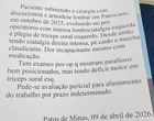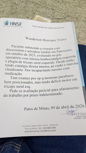 Apesar das intervenções, a recuperação tem sido difícil. O relatório médico indica que ele evoluiu no pós-operatório com intensa lombociatalgia esquerda e plegia (paralisia) do tríceps sural esquerdo, apresentando hoje "pé caído" e marcha claudicante. O médico destaca que a dor é incapacitante, mesmo com o uso de medicação, e solicita avaliação pericial para afastamento do trabalho por prazo indeterminado.