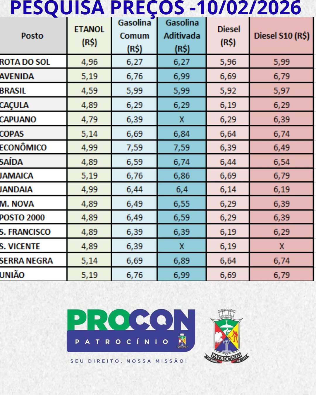 A Prefeitura Municipal, por meio do PROCON Patrocínio, divulgou na terça-feira 10/02 o resultado da pesquisa de preços de combustíveis realizada nos postos do município. O levantamento contempla os valores praticados para etanol, gasolina comum, gasolina aditivada, diesel e diesel S10.