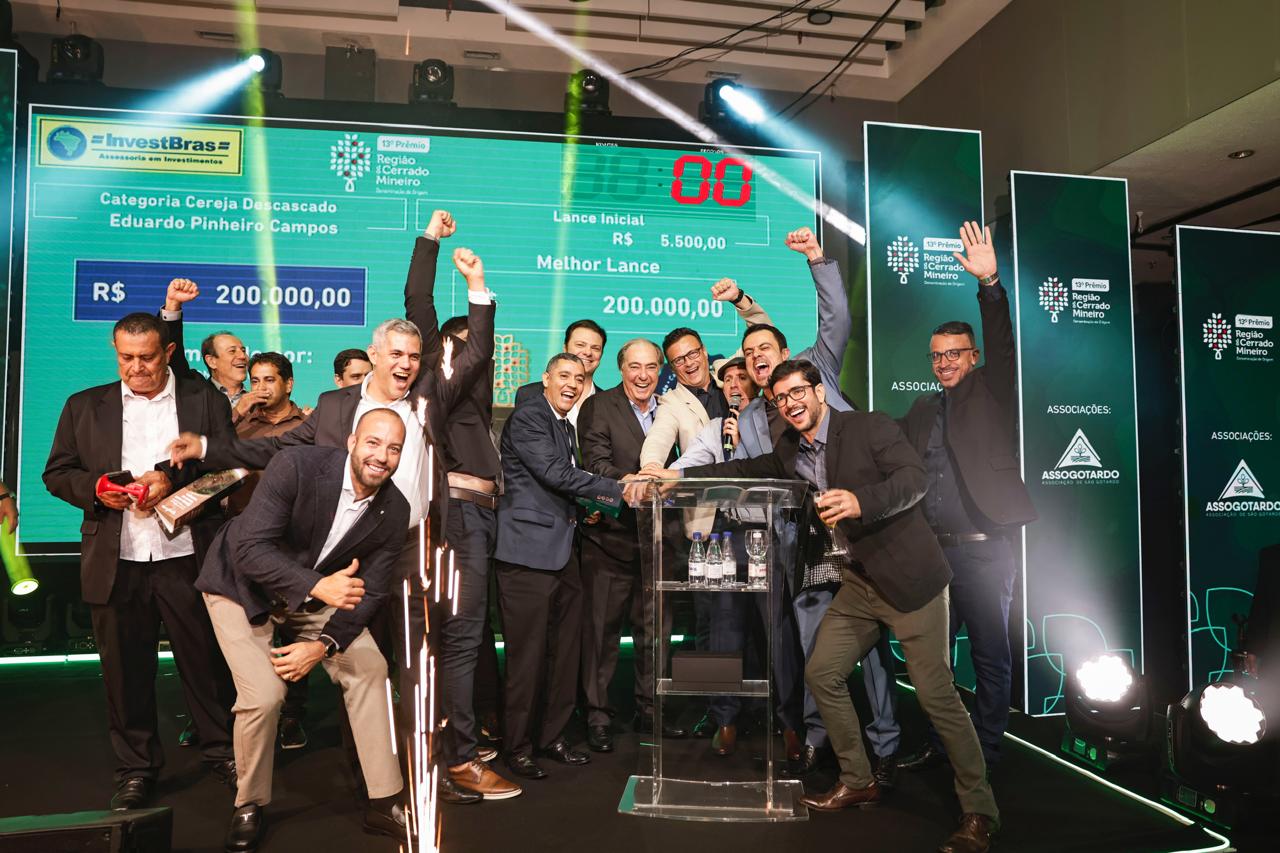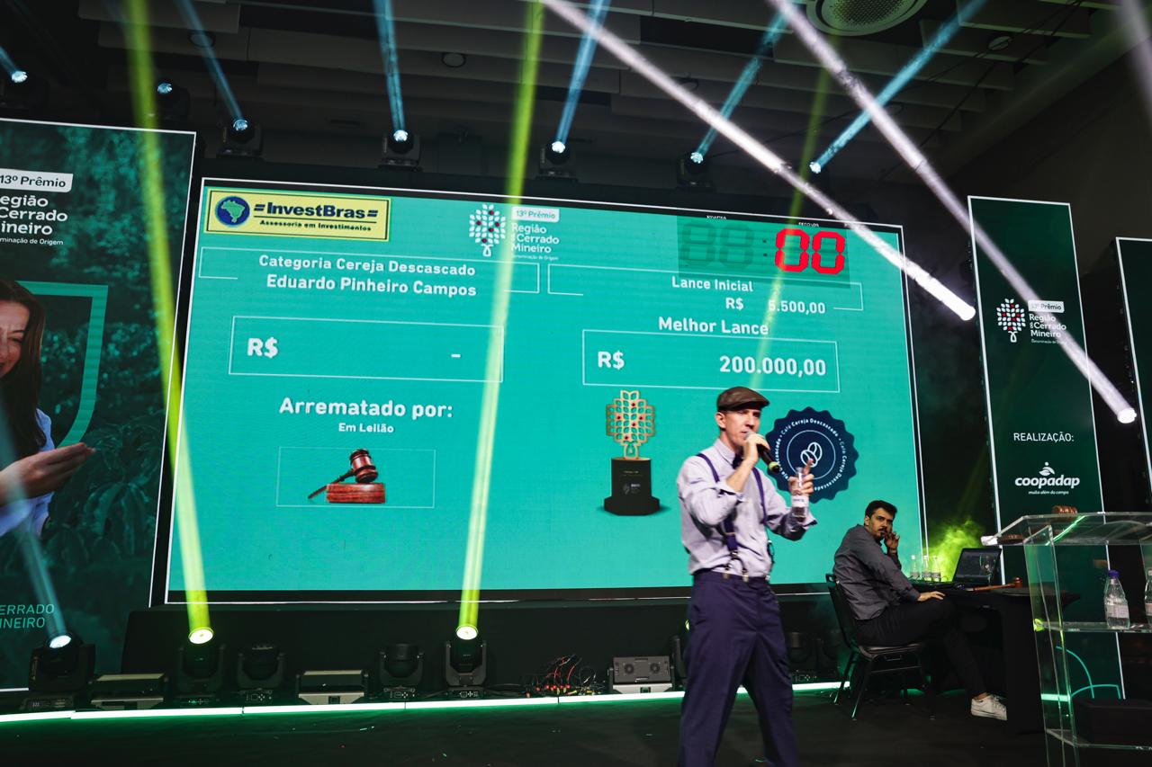 O Leilão Solidário, realizado durante a cerimônia presencial em Uberlândia, movimentou R$ 562 mil, com uma média de R$ 62,4 mil por saca. A saca campeã da categoria Cereja Descascado, produzida por Eduardo Pinheiro Campos, da Fazenda Dona Nenem, em Presidente Olegário, foi arrematada por R$ 200 mil — o maior valor já registrado por uma saca de café em um leilão nacional.