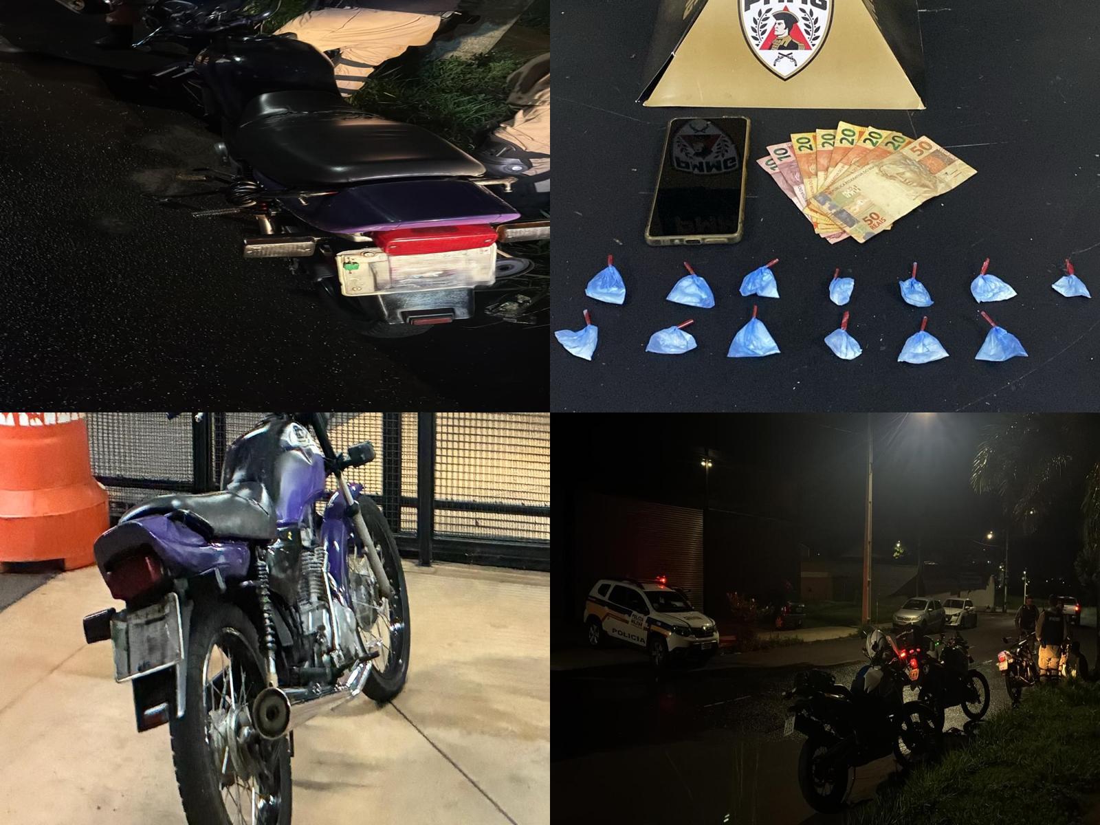 Na noite de 19 de março de 2026, por volta das 20h48, uma guarnição policial em patrulhamento pela rua Paulo Luiz Rotelli, no bairro Luizote de Freitas, em Uberlândia, abordou um indivíduo conduzindo uma motocicleta Honda/CG 125 Titan de cor azul. Durante a busca pessoal, os militares localizaram 13 papelotes de substância análoga à cocaína e R$ 170,00 em dinheiro. Após verificação, foi constatado que a motocicleta utilizada possuía queixa de furto, ocorrido em 19 de fevereiro de 2026, na avenida João Pinheiro, bairro Fundinho. Diante dos fatos, o suspeito foi preso em flagrante pelos crimes de tráfico de drogas e receptação, sendo encaminhado à Delegacia de Plantão. A motocicleta foi removida ao pátio credenciado.
