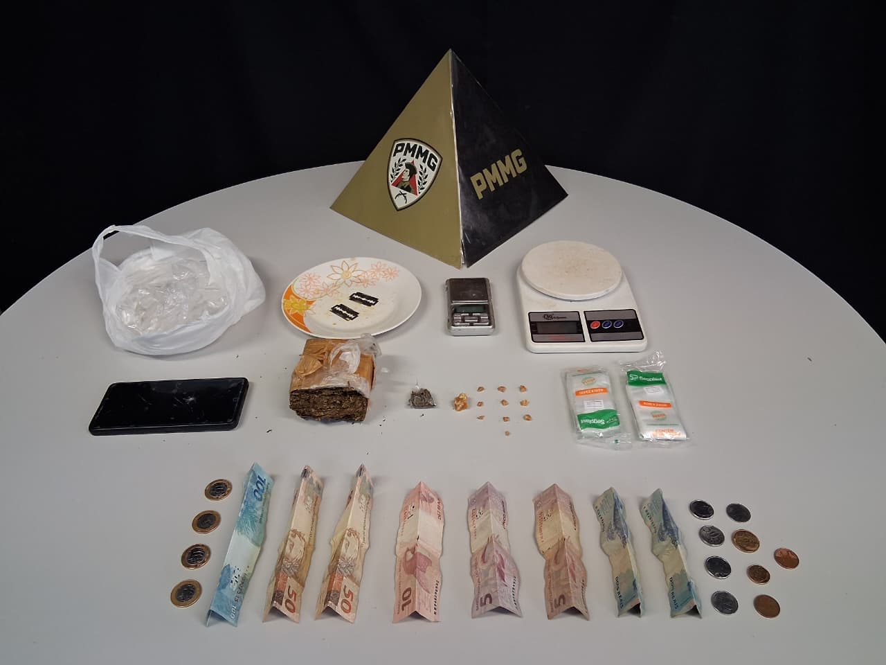 Foram apreendidos: uma barra de maconha, uma bucha de maconha, uma pedra bruta de crack (que, se fracionada, renderia aproximadamente 15 pedras), 10 pedras de crack em tamanho comercial, duas balanças de precisão, material para dolagem, R$130,95 e um celular.