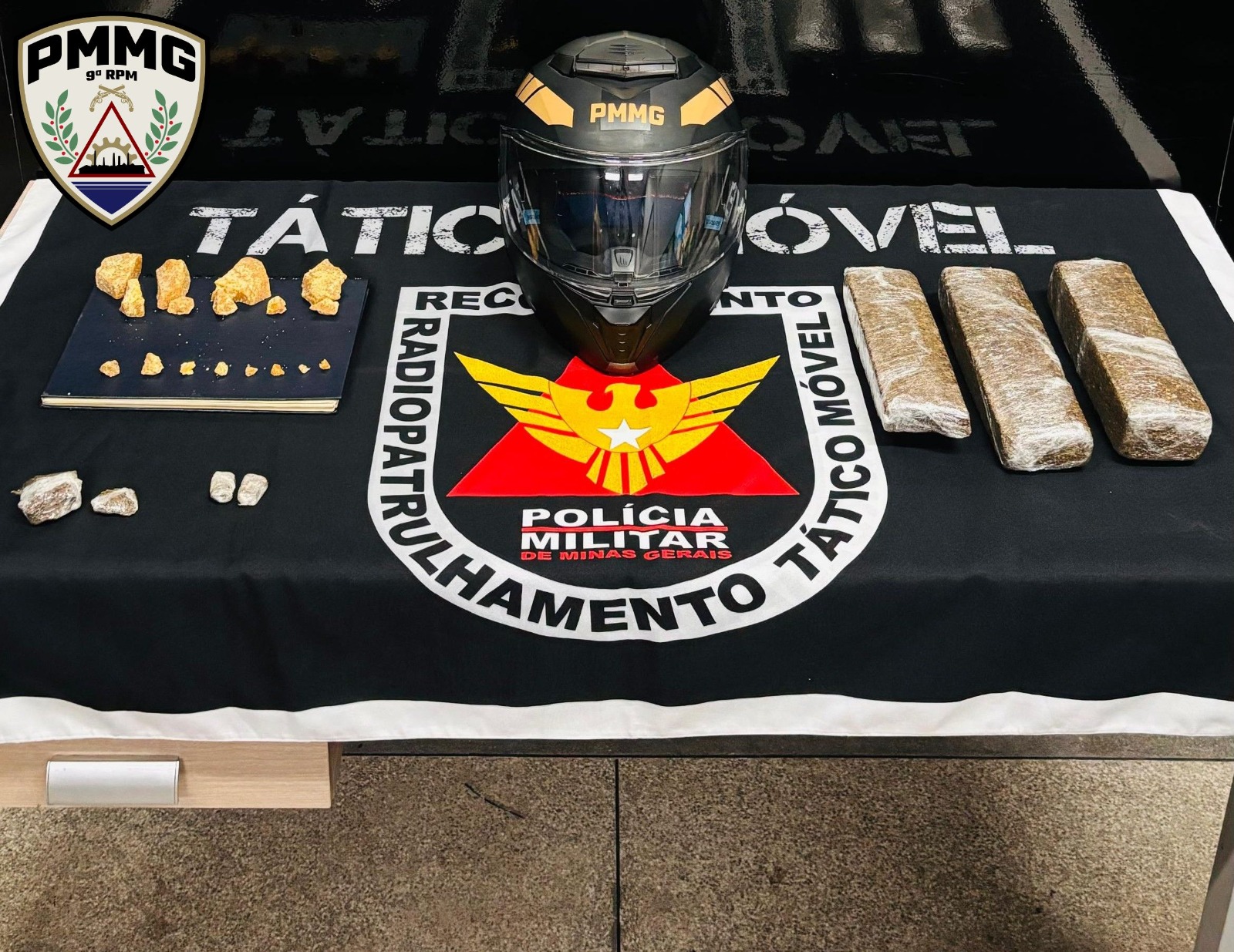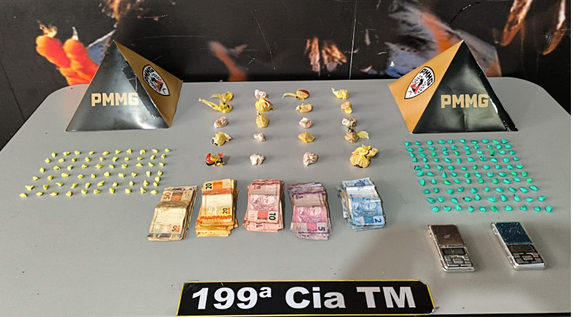 Na noite de 20 de março de 2026, às 20h37, uma guarnição visualizou um homem em atitude suspeita conduzindo uma motocicleta Honda/CG 160 Titan EX preta na Avenida Aldo Borges Leão, bairro Morada Nova. O condutor evadiu-se, mas foi acompanhado e abordado na entrada do bairro Pequis. Com o passageiro, foram localizadas oito porções de crack. Em diligências subsequentes em um imóvel na Avenida Aldo Borges Leão, foram encontradas três barras de maconha e nove pedras grandes de crack. Os suspeitos, de 20 e 22 anos, foram presos e a motocicleta removida ao pátio.